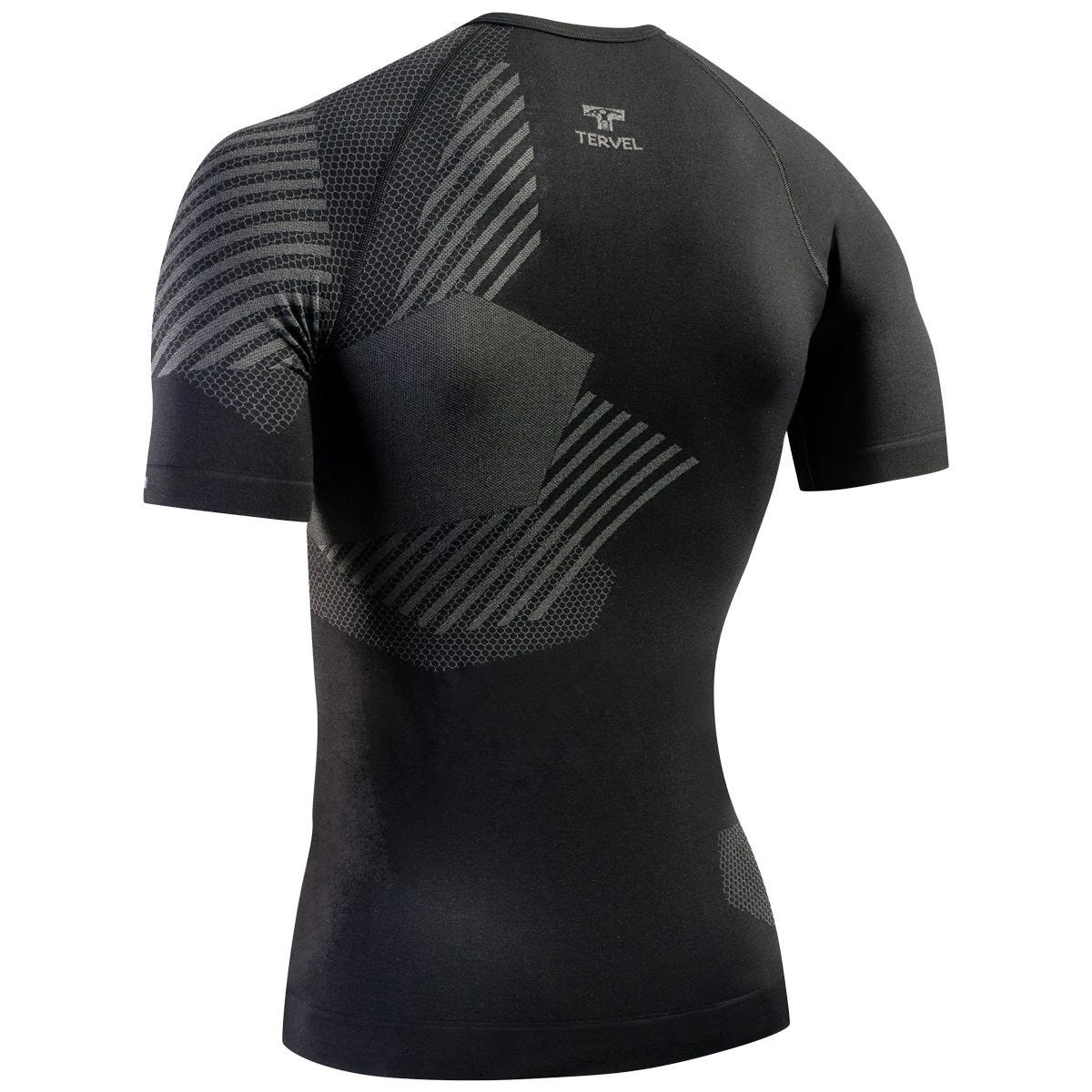 breathable mesh elements. The shirt’s outer layer receives and drainages